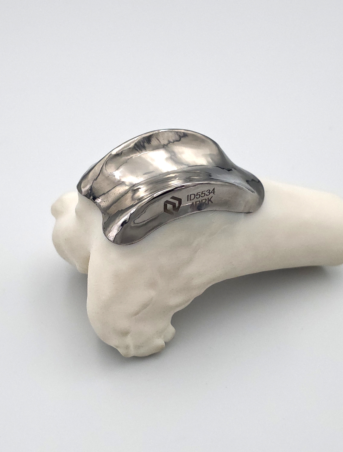 Fixation relies entirely on the latticed pin structure integrated into the inner surface of the implant. These pins are press-fitted into precisely positioned holes created with the included patient-specific drilling guide, providing immediate mechanical grip. Over time, bone ingrowth into the titanium lattice provides additional biological stability. A custom fixation aid ensures correct implant orientation during placement.